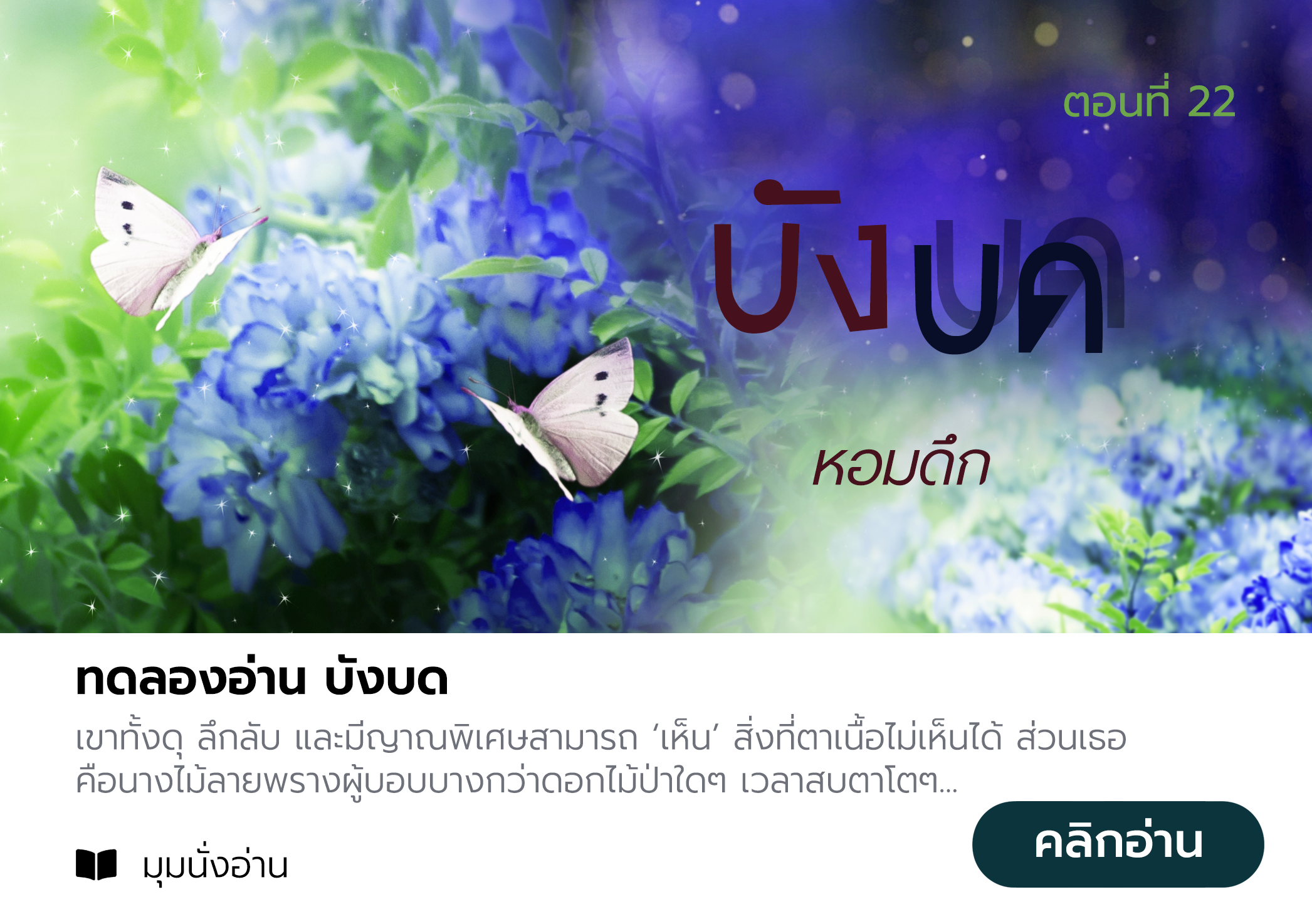 เขาทั้งดุ ลึกลับ และมีญาณพิเศษ สามารถ ‘เห็น’ สิ่งที่ตาเนื้อไม่เห็นได้ ส่วนเธอคือนางไม้ลายพรางผู้บอบบางกว่าดอกไม้ป่าใดๆ เวลาสบตาโตๆ ขวางๆ หน้างอง้ำขัดอกขัดใจ มันน่าจับพาดบ่าหวดเข้าให้สักทีสองที!